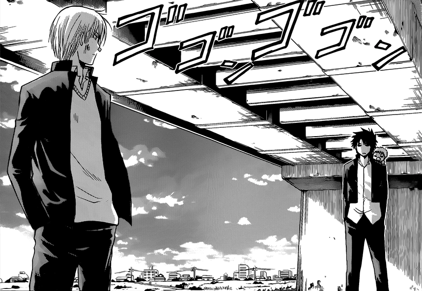 Instead, Oga meets with Furuichi at the river nearby. He asks that Furuichi hand him back the tissues and threatens to beat him for it if he has to; upon hearing his response, Oga remarks that he is an idiot.[28] He then tells Furuichi that he will lose even with his Demonic tissues. Afterwards, the two initiate a battle stance, causing them to reflect on when they first fought seriously. The two end up being distracted by which childhood incident was the first time where they fought against each other until both decide to simply start their fight.[29]