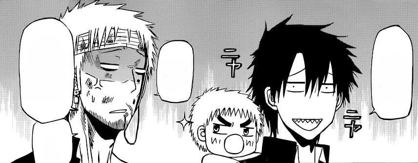 The next day, Oga takes Beel to school with him. Furuichi wonders out loud why he would go through that much trouble for the kid. The story continues with Hajime Kanzaki's mercenary forces coming in contact with Oga. Furuichi is worried about Oga's status among the students at Ishiyama High. The students are convinced Oga is the father of Beel and are shocked by their self-prescribed qualifications. Oga becomes aware of Hajime Kanzaki's status as among the four Tohoshinki. Being the somewhat sadistic and irresponsible teen that he is, Oga seeks out Kanzaki in an attempt to force Beel on him. His logic was that "strong men" were most appealing to Beel, and that the most malicious of characters would satisfy his needs. When the two meet, the discussion takes a dangerous turn as Kanzaki sends one of his own men flying with a direct attack (after annoying him). Beel was touched on the head by Kanzaki. Oga realized that Kanzaki was rejected as Beel did not react, and in retaliation, sent Kanzaki flying. Leaving Kanzaki's men completely shocked, Oga leaves the area feeling rather disappointed.
