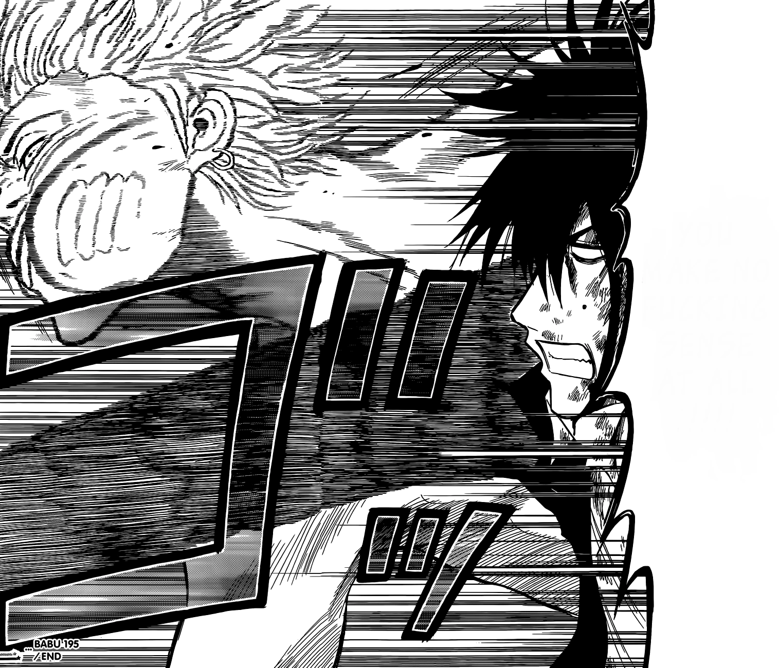 The two end up going to the infirmary together; while on the way, Oga comments that the new tissues stuffed in Furuichi's nostrils suit him. Suddenly, Furuichi begins rambling about a flower-like scent and about a bug that just landed on Oga; Oga, who does not smell or see anything particular, thinks that Furuichi has developed a serious disease. He is then unexpectedly punched in the face. Irritated, Oga tells Furuichi that he needs to face the consequences and kicks him as he runs away. However, Furuichi then turns back to Oga who then starts punching him. Oga is caught by surprise with Furuichi's apparent skill in evasion and is subsequently buried down into the floor. An infuriated Oga rises back up from the floor and, upon realizing that Furuichi is gone, asks Baby Beel about where he went off to.[15]